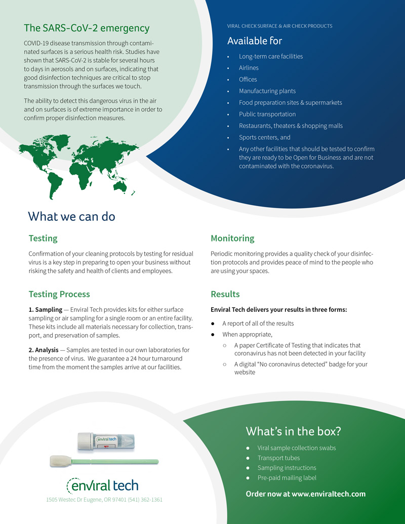 Enviral Tech, a small company based in Eugene, Oregon asked me to design their first product brochure. The COVID-19 pandemic has provided the world with a wealth of challenges and Enviral Tech creates surface testing kits for organizations.