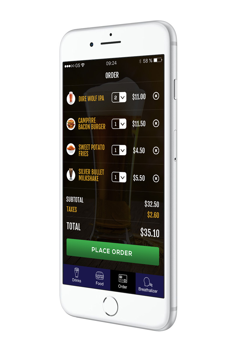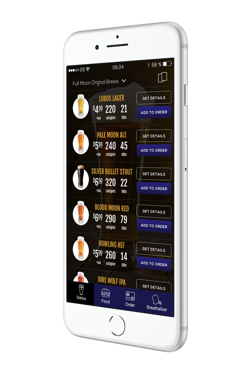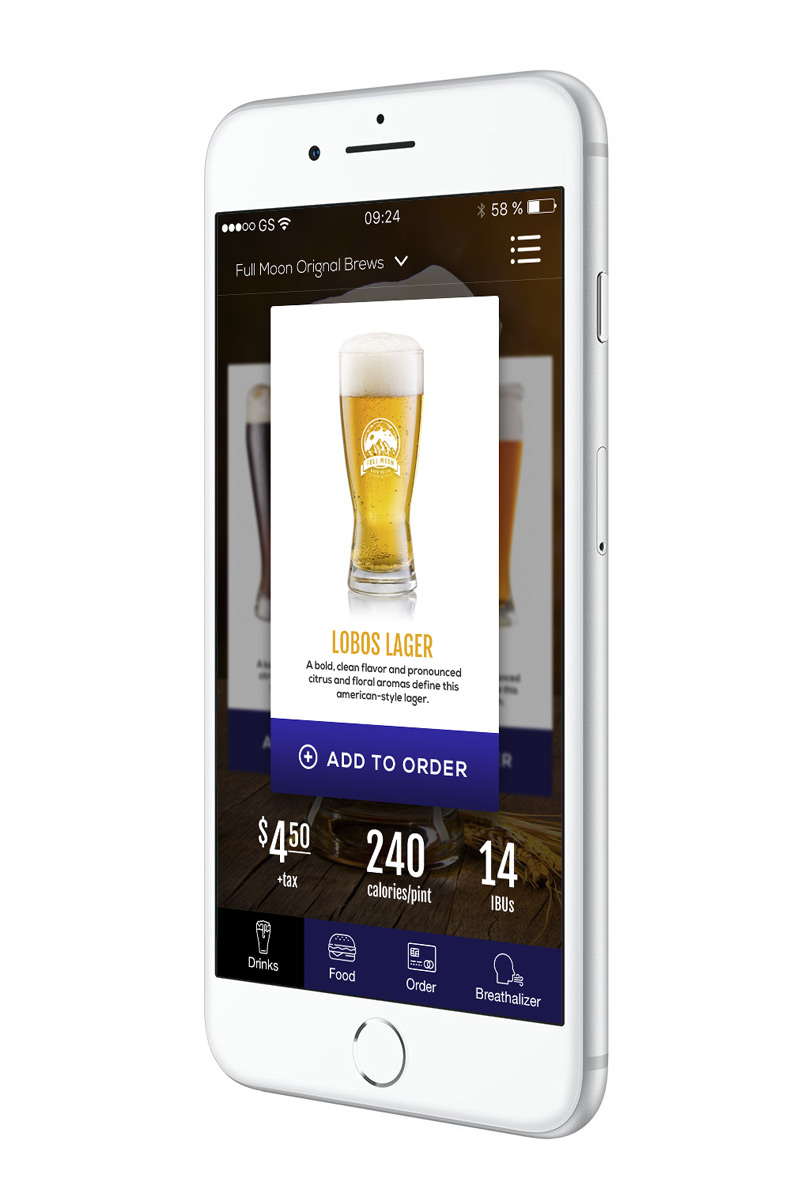 Full Moon Brewing Co. is a mobile app concept meant to assist brewery patrons with ordering food and drinks — all from the comfort of their booth. Just open your app, find what you want, and pay for it right there. I’ve also added a breathalyzer feature (attachment required) to help patron gauge their ability to drive home safely.